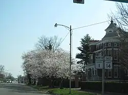 After the village of Grayville, IL 1 turns northeast and runs along a general parallel with the Wabash River. The route passes through the village of Keensburg before reaching the village of Mount Carmel. Now in Wabash County, IL 1 runs northeast through the village as West Third Street. At the junction with Walnut Street, IL 1 meets IL 15, which connects to State Route 64 (SR 64) in Indiana. Continuing northeast, IL 1 and IL 15 run concurrently to the junction of North Market Street, where they turn northwest to the intersection with East Ninth Street. There, IL 1 and IL 15 split in different directions, with IL 15 heading southwest while IL 1 runs northeast on East Ninth Street. The route continues on East Ninth Street for two blocks, where the road turns northwest on North Cherry Street. Along North Cherry Street, IL 1 turns north and winds out of Mount Carmel.[3]