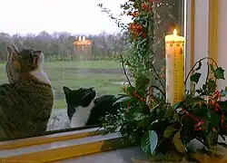 An illumination is an Advent, Christmastide, and Epiphanytide decoration in the form of a lighted candle originating in the Moravian Church.[1] These lighted candles are placed in the windows of Moravian Christian churches and homes in the evening with the symbolism to "guide the footsteps of the infant Jesus" to their settlements.[1][2] Diane Frantz, a Moravian librarian explicated this, stating that "the Christ child bearing bundles of evergreens wanders all over the world. Those who long for his coming set a lighted candle in the window to welcome him into their home and hearts."[2] Illuminations are first erected on the First Sunday of Advent and are traditionally removed at the end of the Christmastide-Epiphanytide season, which is historically Candlemas. Illuminations are popular in Moravian settlements such as Old Salem, Bethlehem and Lititz, though this custom has spread among the membership of other Christian denominations.[1] In the Moravian town of Herrnhaag, due to the abundance of illuminations there "it appeared from Budingen as though the whole hilltop were a single sea of flames."[1] Brought by Moravian missionaries from Saxony to Bethlehem, illuminations were first used in North America as early as 1741.[2] Though illuminations are traditionally lighted candles, in the modern day, these can be electric candles.[3]