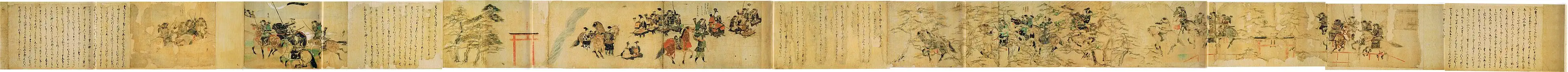 In the first scroll, twenty-nine year old Suenaga and his clansmen meet with commander Saburō Kagesuke, who would later testify in his favor before the government. They gather their forces, and travel to Hakata to meet the Mongol invaders, passing the torii gates of Hakozaki Shrine on the way.