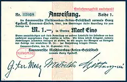 Hanomag's emergency money (Notgeld) from 1916 with signatures of father Gustav ter Meer, and railway engineer Erich Metzeltin