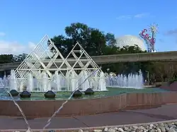 Glass pyramids of Imagination! with the jumping fountains in the foreground.