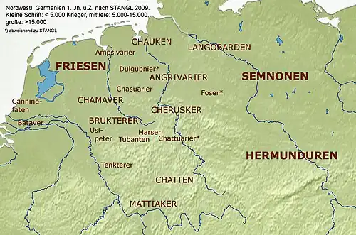 The Germanic tribes around the time of the immensum bellum The participation of other tribes is uncertain. The Sugambri on the right bank of the Rhine may have used the opportunity to take revenge for the kidnapping of their envoys in 8 BC.[11] Peter Kehne even considers it possible that the main source of unrest was the Sugambri.[8] It is unclear whether the unmentioned Cananefates (or Chamavi), Batavians, Usipetes, Marsi, Tencteri and Tubantes stayed away from the uprising or surrendered to Vinicius.[12] It must also remain uncertain which tribes "with an almost unknown name"[13] translated by are meant, which Velleius reports as defeated. The confrontation with the Elbe Germanic tribes of the Lombards, Hermunduri and Semnones in the last year of the war does not necessarily indicate their initial participation in the uprising.[14]