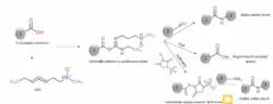 Another process of creating immunoliposomes is by using a thiol group and creating a thioether bond.[6] The sulfhydryl group is a key player can is found in cysteine bridges on proteins and reagents like Traut’s reagents, SATA, and Sulfo-LC-SPDP.[6] The reduction or hydrolysis of these groups generates thiol groups that create antibody conjugation to lipids.[6] There are multiple methods of this process, and one uses the crosslinking agent SATA as shown in Figure 3.[6] The ester end of SATA reacts with amino groups in proteins to form an amide link and a molecule with a protected sulfhydryl group.[6] In order to continue the reaction, this group must be freed which is done by adding hydroxylamine. The following step is to add a chemical that can be an anchor between the lipid and the thiol group. Some examples of molecules that are capable of being this anchor are maleimide, iodoacetyl groups or 2-pyridyldithiol groups.[6] Ultimately, these steps create an antibody-enzyme conjugate that has been formulated using a thiol group.[6]