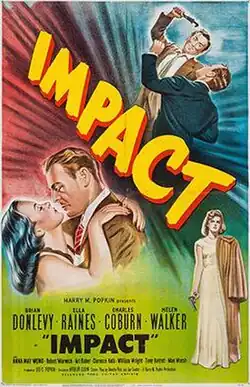 Impact is a 1949 American film noir drama film starring Brian Donlevy and Ella Raines. Directed by Arthur Lubin, it was shot entirely in Northern California, including scenes in Sausalito at Larkspur in Marin County, on Nob Hill in San Francisco, and throughout the Bay area. The screenplay was based on a story by film noir writer Jay Dratler. Charles Coburn, Helen Walker, Anna May Wong, Philip Ahn, and William Wright appear in support.