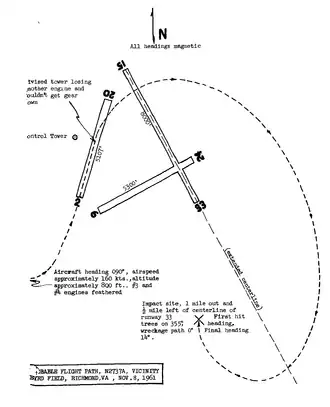 1. ^ a b c d e f g h i j k l m n o p q r s t u v w x y z aa ab ac ad ae "Aircraft Accident Report: Imperial Airlines, Inc., Lockheed Constellation L-049, N 2737A, Byrd Field, Richmond, Virginia, November 8, 1961". Civil Aeronautics Board. February 6, 1962. doi:10.21949/1500789. SA-365, File No. 1002. Retrieved February 5, 2020.