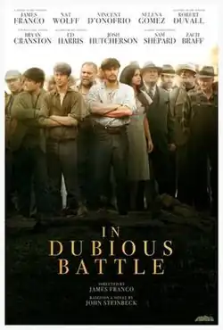 In Dubious Battle is a 2016 drama film directed and produced by James Franco, loosely based on John Steinbeck's 1936 novel of the same name, with a screenplay by Matt Rager. The film features an ensemble cast, consisting of Franco, Nat Wolff, Josh Hutcherson, Vincent D'Onofrio, Robert Duvall, Selena Gomez, Keegan Allen and Ed Harris. The film had its world premiere at the Venice Film Festival on September 3, 2016.[3]
