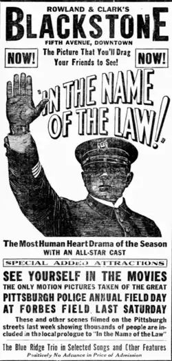 67. ^ "Police Here To Play In New Film Drama". The Gazette Times. Pittsburgh, Pennsylvania. September 10, 1922. sec. 2, p. 2. Retrieved November 29, 2020 – via newspapers.com. Chief and Staff with men to be photographed on Streets tomorrow