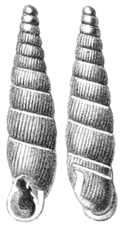 Diagnosis: The entire teleoconch is with sharp, mostly whitened riblets. The parietal side of the apertural border is protruding. Lamella columellaris is shortly protruding into the aperture. The lower part of the lunella is obsolete.[3] The subspecies was characterized, with the designation of a lectotype, by Nordsieck (1972).[3][4]