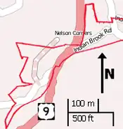 The district consists of two irregularly shaped areas along unpaved Indian Brook Road joined by a narrow corridor along the brief, paved section of Route 9 that connects them. These boundaries reflect the extent of Nelson's Corner during its peak period of growth in the late 19th century. They include all of ten separate lots.[2]