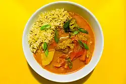 Geographically, India and China are neighbours; historically, the two nations are ancient empires. Two of the most populous countries in the world today, both India and China boast lengthy histories. Since the second century CE, Hindu rulers presided over Southeast Asian countries and Chinese regimes ruled the more eastern regions, such as Vietnam.[11][12] Similarly, Asia's southeast was historically populated by immigrants from both China and India, namely the Han and Tamil ethnic groups who joined scattered aboriginal societies.[10] The influences of China and India can be detected in the cuisines of Southeast Asia, where the two culinary practices have been combined, adapted, and developed by generations of people. For example, the Chinese practice of rice cultivation was introduced to the regions of Southeast Asia and Nepal in the thirtieth century BC, where it has existed as an irreplaceable and undeniable staple ever since.[13] Furthermore, now completely embedded within Southeast Asian culinary practices, Chinese cooking and eating implements such as spoons, chopsticks, and woks were other products which were introduced to the region.[14] Evidence of Indian influence, in addition to religious philosophies and ancient architecture, can be found in the spices and flavours of Southeast Asian cooking.[11] Curries—meat, fish, or vegetables cooked in a spiced sauce accompanied by rice or bread—originated on the Indian subcontinent, but have since diffused throughout Asia.[15] Spices such as turmeric, coriander, pepper, brown mustard, and ginger are present in curries throughout Southeast Asia, though each country has adapted the practice to utilize their own regional ingredients as well. Most notably, Indonesian, Malaysian, Thai, Filipino, and Cambodian cuisines all have strong ties to Indian-style curry flavours.[15] These aspects of both Chinese and Indian culinary practices and traditions have combined to create the origins of what is now a rich and diverse culinary scene making up Asia's southeastern region. Thus, with the joined influence of the two cultures, Southeast Asian cuisine itself is another example of Indian Chinese food origins.