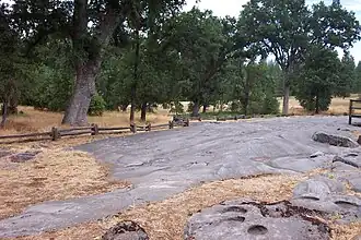 Indian Grinding Rock State Historic Park is a California State Park, preserving an outcropping of marbleized limestone with some 1,185 mortar holes—the largest collection of bedrock mortars in North America. It is located in the Sierra Nevada foothills, 8 miles (13 km) east of Jackson. The park is nestled in a little valley 2,400 feet (732 m) above sea level, with open meadows and large specimens of valley oak that once provided the Miwok peoples of this area with an ample supply of acorns.[2] The 135-acre (55 ha) park was established in 1962[3] and listed on the National Register of Historic Places in 1971.