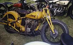Designed by Charles B. Franklin,[1][3] the Scout was introduced in October 1919 as a 1920 model. The Scout had a sidevalve V-twin engine with its transmission bolted to the engine casing, allowing a geared primary drive - the only American v-twin to use this maintenance-free system.[4] The Scout engine initially displaced 606 cc (37 cu in), but the engine size was increased to 745 cc (45 cu in) in 1927 in response to the popularity of the Excelsior Super X.[1][5] In early 1928, a front brake was added to the Scout.[6]