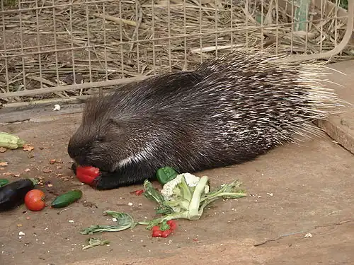 Indian crested porcupines have a very broad and mostly herbivorous diet.[2] They consume a variety of natural and agricultural plant material, including roots, bulbs, fruits, grains, drupe and tubers, along with insects and small vertebrates.[2][3][13][14] Because they are cecal digesters, they are able to exploit low quality forage.[15] They have also been known to chew on bones to acquire minerals, such as calcium, that aid in quill growth.[3][5] Their capability to form substantial fat reserves is a useful adaptation for living in seasonally fluctuating habitats.[7]