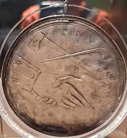 Indian peace medals refer to ovular or circular medals awarded to tribal leaders throughout colonial America and early United States history, primarily made of silver or brass and ranging in diameter from about one to six inches.[1] Medals were often perforated and worn suspended around the neck of the recipient.[1] Controversy remains surrounding the use and impact of peace medals in furthering diplomatic relationships between Native Americans and the federal government. Many Indian peace medals today are archived in museums, libraries, and cultural centers.[2]