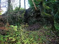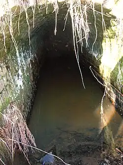 Ladyha No 2 pit was sunk in 1885 to a depth of 568 feet (173 m) and closed in May 1934, having struggled since its main customer, the Eglinton Iron Company, closed in 1928. A fairly substantial brick-lined tunnel still survives which once carried a standard gauge railway line unobtrusively to Ladyha colliery, out of the Earl's sight and the smoke kept away from the kitchen gardens' greenhouses and plants.[38] Other such cosmetic tunnels exist at Alloway and near Culzean Castle.[39] The tunnel was used during World War II as a bomb shelter and storage area for furniture; it remains in good condition. The old colliery ruins were razed to the ground in 2011, having been assessed as a danger to the public.