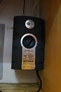 An instant hot water dispenser or boiling water tap is an appliance that dispenses water at about 94 °C (201 °F) (near-boiling). There are hot-only and hot and cool water models, and the water may be filtered as well as heated. Instant hot water dispensers became popular in the 1970s. Instant hot water dispensers are very similar to portable shower devices; the latter is fitted with a heating element and quickly heats up water, once a switch has been activated.
