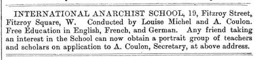 Michel founded the International School in the autumn of 1891, initially using the premises of the Autonomie Club. Due to her lack of fluency in English, Michel agreed that Auguste Coulon, a polyglot she had met at the Autonomie Club, could be the school's secretary and language teacher.[2] The project received the keen support of Peter Kropotkin, who did a fundraising lecture for it at the Athenaeum Hall,[3] Errico Malatesta and William Morris. The newly established school soon moved to a more permanent address in, what is today, Fitzrovia.[4]