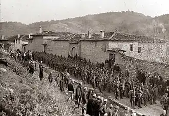 Captain Fabius established a volunteer artillery unit.[33] According to the Austrian government, the volunteers who bombarded the rebels were recruited by the Albanian Committee in Vienna.[34] Till the end of June 1914 Dutch officers were captured by rebels in most of the central Albania. They were gradually replaced with officers from Austria-Hungary and Germany, who arrived in Durrës on 4 July.[1] On 27 July 1914 Colonel De Veer officially tendered the officers' resignations.[35] Soon the First World War broke out, and by 4 August most of the officers had returned home. The rebels captured Berat on 12 July and Vlore, without fight, on 21 August.[36] The last two captured officers (Verhulst and Reimers) were released on 13 September 1914.[37]