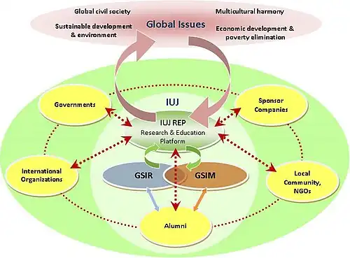 IUJ is the first graduate university in Japan not offering undergraduate degrees, and one of the few Japanese universities which offers all courses in English.[1][2] It was founded in 1982.[3] IUJ offers Master's degrees in International Development, Economics, Public Management, and International Relations, as well as an MBA in business administration. The Digital Transformation Program was established in 2021, another one-year new program the International Public Policy Program will be established in 2022. IUJ is fully approved and accredited by the Ministry of Education, Japan, The Graduate School of International Management proudly obtained accreditation from AACSB in 2018.