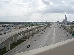 From the western suburb of Katy to downtown, I-10 is known as the Katy Freeway in Houston. This section was widened in 2008 to as many as 26 total lanes, counting the six lanes of the access (frontage/feeder) road, which feature traffic signals, and driveway access and are not limited-access and therefore not technically part of the freeway itself but are directly adjacent.[9] Between the West Beltway and the West Loop, the Katy Freeway features a basic configuration of 14 lanes, featuring seven lanes each direction. This cross-section swells with auxiliary lanes, ramp lanes, and the inclusion of the frontage access roads, although those lanes are controlled by traffic signals. Including auxiliary lanes, ramp lanes, and the access frontage roads, the minimum lane count is 22 total lanes. In this section, the width is 24 lanes at multiple locations and up to 26 lanes east of Gessner Road (12 main lanes, eight lanes of access roads, and six mid-freeway HOT/HOV lanes). From the Fort Bend County line to I-610, there is a minimum of four main lanes in each direction.[10] The maximum number of undivided lanes at any point on the freeway is nine in the eastbound direction approaching Antoine Drive (though this includes one exit-only lane); this is one of the widest sections of undivided highway in a single direction in the world.[11] The widest right-of-way, 556 ft (169 m), occurs at the Katy Freeway's intersection with Bunker Hill;[12] at that point, the expansion plans called for six main lanes plus two toll lanes in each direction along with 10 lanes on the feeder/frontage roads. While this section still features 14 through continuous lanes through the Bunker Hill interchange, when auxiliary lanes, ramp lanes, and the frontage access roads are included, the actual striping after construction delineates 29 lanes, including all 26 of the planned lanes plus an additional lane in each direction to enter or exit the toll lanes and one more turn lane on the eastbound feeder road.[13] Between Texas State Highway 6 and Interstate 610, I-10 HOV/HOT lanes are known as Katy Managed Lanes, or simply known as Katy Tollway.