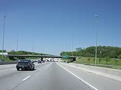 I-55 within Illinois carries heavy traffic, with an average of more than 20,000 vehicles per day for most of its length.[4] Significant portions of I-55 contain six lanes (three lanes in each direction) and are heavily used by commuters.[5] I-55 in Illinois begins in East St. Louis on the Poplar Street Bridge over the Mississippi River at the Missouri state line and runs southwest to northeast through the state,[5] ending in Chicago at US 41 (Lake Shore Drive). Along the way, it goes through four metropolitan areas in the state: the Illinois portion of the St. Louis metropolitan area, the Springfield metropolitan area, the Bloomington–Normal metropolitan area, and the Chicago metropolitan area (also known as Chicagoland).[5]