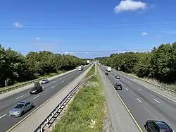 I-95 has at least four incomplete interchanges along its route, with three located within the city of Baltimore. Traveling northbound, the first interchange encountered is the College Park Interchange, exit 27. This was the intended site of the northern crossing of I-95 and I-495 and the northern end of the Northeast Freeway. South of here, I-95 was to enter D.C. on the Northeast Freeway, continue on the North Central Freeway and connect seamlessly to the portion of I-95 in downtown Washington that had been completed from there to the Springfield Interchange in Virginia. While the College Park Interchange was completed, the Northeast Freeway was never built, resulting in highway lanes coming to an abrupt end on the south end of the interchange. After the project to complete I-95 through the District of Columbia was canceled, I-95 was rerouted onto the Capital Beltway in 1977. The portion of I-95 inside the beltway in Northern Virginia and the District of Columbia was designated as I-395. The eastern half of the Capital Beltway was renumbered from I-495 to I-95.[23] In 1991, the I-495 designation was restored on the eastern half of the beltway, numbered concurrently with I-95 as part of an effort to provide more consistent numbering and directional indicators on the Capital Beltway.[24] The College Park Interchange was modified in late 1986 to allow free movement along the transition from the I-95 corridor and the Capital Beltway without requiring the use of exit ramps. Today, all parts of the interchange are in regular use. The southern end of the interchange now serves as a park and ride commuter lot.