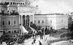 This marked the commencement of festivities that persisted for three days,[39] during which the Acropolis of Athens and the Olympieion were illuminated in honor of the sovereign.[35][40] One year later, after the enactment of a revised fundamental law by his subjects, the king reiterated his oath of loyalty before the Assembly for a final time on November 28, 1864.[41][42]