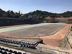The field was renovated in 2010 and features a clay running track, a tartan track for sprint, a tarmac surface for handball and volleyball, as wells as two jumping areas. The stands have a total capacity of 2,300 seats, a part of them being covered. Outside classes, it is open to the public for free.[2]