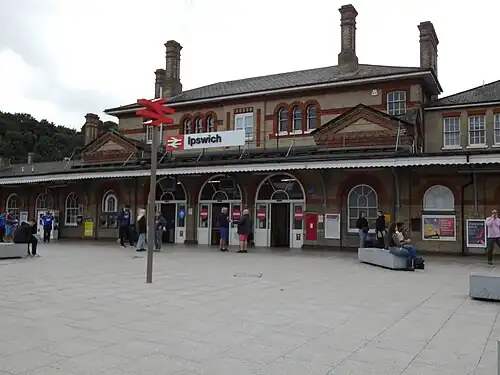 Ipswich railway station is on the Great Eastern Main Line in the East of England, serving the town of Ipswich, Suffolk. It is 68 miles 59 chains (110.6 km) down the line from London Liverpool Street[1] and, on the main line, it is situated between Manningtree to the south and Needham Market to the north.