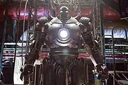 Favreau wanted the film to be believable by showing the construction of the Iron Man suit in its three stages.[16] Stan Winston, a fan of the comic book, and his company, who Favreau worked with on Zathura (2005), built metal and rubber versions of the armor.[22] The Mark I design was intended to look like it was built from spare parts. The back is less armored than the front, because Stark would use his resources for a forward attack. It also foreshadows the design of Stane's armor. A single 41-kilogram (90 lb) version was built, causing concern when a stuntman fell over inside it, though both the stuntman and the suit were unscathed. The armor was also designed to have only its top half worn at times.[22] Stan Winston Studios built a 3.0-metre (10 ft), 360-kilogram (800 lb) animatronic version of Iron Monger (Obadiah Stane),[22] a name which Stane calls Tony Stark and himself earlier in the film as a reference, but is never actually used for the suit itself in the film. The animatronic required five operators for the arm, and was built on a gimbal to simulate walking.[22] A scale model was used for the shots of it being built.[38] The Mark II resembles an airplane prototype, with visible flaps.[38] Iron Man comic book artist Adi Granov designed the Mark III with illustrator Phil Saunders.[85] Granov's designs were the primary inspiration for the film's, and he came on board the film after he recognized his work on Favreau's MySpace page.[60] Saunders streamlined Granov's concept art, making it stealthier and less cartoonish in its proportions,[22] and also designed the War Machine armor, but it was "cut from the script about halfway through pre-production". He explained that the War Machine armor "was going to be called the Mark IV armor and would have had weaponized swap-out parts that would be worn over the original Mark III armor", and that it "would have been worn by Tony Stark in the final battle sequence".[86]