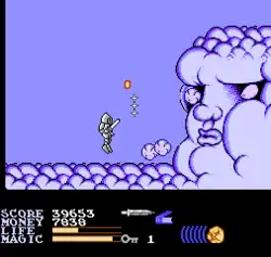 The animation of the eagle (the "Eagle King") that transports Kuros to the Wind Elemental was one of Ste Pickford's first graphics which he drew for the NES. It was done in Deluxe Paint for the Amiga with sketching done by mouse - without assistance from graphics tablets or other scanners. He took eagle drawings from a book on animals in motion by Eadweard Muybridge. Pickford wanted to show off the possible graphical capabilities of the NES; he said, "I wanted to do something 'flashy' early in the game, trying to show off my amazing graphic art skills on the rather primitive NES. We were working on Amiga and ST games at the same time, so were always trying to push the NES with bigger and better graphics, right from the start of our work on the machine." The eagle consisted of only three colors and between 11 and 17 sprites per frame of animation. There was a smaller version of the same eagle, which was used as a regular enemy in that level.[8]