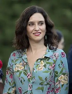 Isabel Natividad Díaz Ayuso (Spanish pronunciation: [isaˈβel ˈdi.aθ aˈʝuso]; born 17 October 1978) is a Spanish politician and journalist serving as the president of the Community of Madrid since 2019.[1] She is also the president of the People's Party of the Community of Madrid since 2022.