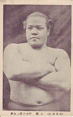 Isenohama was born into a sumo family, his father was Isenohama Ogiemon (伊勢ノ濱荻右エ門), a former maegashira professional wrestler (rikishi) who was active in the mid-Meiji era (1880s) in the old Ikazuchi stable.[2] His grandfather was the 9th generation Kimura Shōtarō, a san'yaku gyōji and his cousin was Negishi Jiemon, an elder in the Sumo Association and master of the eponymous stable. He was an apprentice in a sake shop in Nihonbashi, but is said to have shown the same strength as his father, and at the age of 18 he decided to join the stable of his cousin Negishi, making his first appearance in the ring in the January 1902 tournament. There, he inherited his father's shikona, or ring name. However, as Negishi's stable did not have a ring, he went to the prestigious Tomozuna stable, where he was trained by future-yokozuna Tachiyama and future-ōzeki Kunimiyama. He rose quickly through the ranks, being promoted to jūryō in the May 1905 tournament, and became a makuuchi wrestler at the May 1906 tournament.