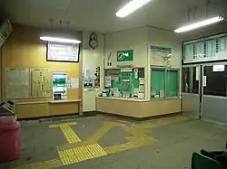 The station has two opposed side platforms, connected to the station building by an overhead passage. The station is staffed and has a Midori no Madoguchi ticket office.