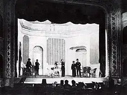 On Thursday, January 20, 1916, matinee performance was for women, soiree was for men. Shortly after this representation, Darülbedayi, who fell into trouble with money, closed the music section on 14 March 1916. In 1917, 3000 lira of aid was reduced to 1000 lira.[5] In the meantime, Darülbedayi staged the first indigenous play "Baykuş" written by Halit Fahri Ozansoy (2 March 1917), and Muhsin Ertuğrul put on the stage this play which was approved by audiences. The second indigenous play was Yusuf Ziya Ortaç's "Binnaz" (1919). In the meantime, the school section, which was closed economic reasons, started to work again and moved to a house in Hamalbaşı (Beyoğlu) from Letafet Apartment in Şehzadebaşı.