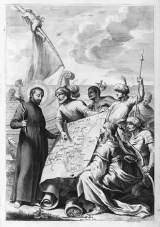 L'Asia (1653) in eight books, undertakes the story of the missions in India, concentrating on the Portuguese colony in Goa, where Xavier arrived in 1542. Saint Paul's College, Goa was the center of the Asian missionary enterprise with its schools and printing presses where Henrique Henriques wrote Christian texts and the first Tamil dictionary. The work also deals with the mission of Xavier to Japan in 1549 in Book 3 and the story of the first Jesuits in Japan under Cosme de Torres up to 1570 in Book 8.[3] Bartoli narrates the story of the Jesuit mission to Akbar the Great in Fatehpur Sikri of Rodolfo Acquaviva and of his martyrdom in Salcete in 1581 in a smaller work of 1653 Missione al Gran Mogor del p. Ridolfo Acquaviva[4] This was added to the third edition of L'Asia in 1667. It has a fine title frontispiece engraving of Xavier and the Orient by the same artists who illustrated the second edition of the life of the founder in 1659.