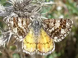 The larvae feed on Cytisus, Genista, Sarothamnus, Spartium and Ulex species. It overwinters as a pupa in the ground.