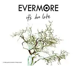 "It's Too Late" is the lead single from Evermore's debut album, Dreams (September 2004), which peaked at No. 16 on the ARIA Singles Chart.[1] The group consists of three New Zealand-raised brothers, Jon (lead vocals, lead guitar), Peter (backing vocals, piano, keyboards, bass guitar), and Dann Hume (backing vocals, drums) – they co-wrote "It's Too Late".[2] Evermore worked with producers Barrett Jones (Nirvana, Foo Fighters, Whiskeytown)[3] and (Dave Matthews Band, John Mayer).[4][5]