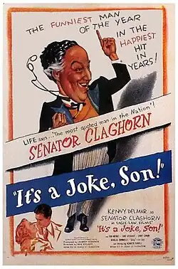 It's a Joke, Son! is a 1947 American comedy film directed by Benjamin Stoloff (in his final directorial role in a film) featuring radio comedian Kenny Delmar as Senator Beauregard Claghorn, a character on Fred Allen's radio program and later the inspiration for the cartoon character Foghorn Leghorn.[3] The film was the first American production for Eagle-Lion Films,[4] and although it was produced on a very small budget compared to other Hollywood films,[2] it was a box-office disappointment; one theater chain removed the film after less than a week after it only drew $1,000 in ticket sales.[5]