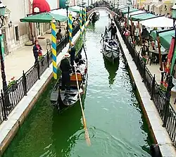 Italia Mura opened on 2 April 2005 as a "convenient way for [Japanese] people to get a taste of something different".[2] The park featured imported Italian gondolas operated by Italians on a replica of a Venice canal, a replica of St Mark's Campanile at the entrance to the park, a replica of Michelangelo's famous David statue, a replica of the Bocca della Verità, as well as 80 Italian themed restaurants and stores.[2][1] The facility was about 31,000 square metres (7.7 acres) in size.[1]