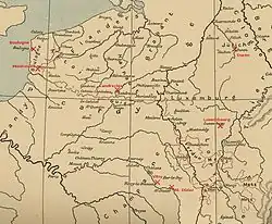 Concerned about the fate of his ally, Francis ordered the Duke of Orléans and d'Annebault to attack Luxembourg, which they took on 10 September; but it was too late for Wilhelm, as he had already surrendered on 7 September, signing the Treaty of Venlo with Charles.[25] By the terms of this treaty, Wilhelm was to concede the overlordship of the Duchy of Guelders and County of Zutphen to Charles, and to assist him in suppressing the Reformation.[26] Charles now advanced to besiege Landrecies, seeking battle with Francis; the French defenders of the town, commanded by Martin du Bellay, repulsed the Imperial attack, but Francis withdrew to Saint-Quentin on 4 November, leaving the Emperor free to march north and seize Cambrai.[27]