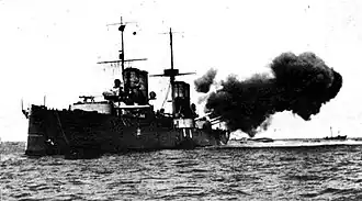 San Giorgio was based at Brindisi when Italy declared war on the Central Powers on 23 May 1915. That night, the Austro-Hungarian Navy bombarded the Italian coast in an attempt to disrupt the Italian mobilization. Of the many targets, Ancona was hardest hit, with disruptions to the town's gas, electric, and telephone service; the city's stockpiles of coal and oil were left in flames. All of the Austrian ships safely returned to port, putting pressure on the Regia Marina to stop the attacks. When the Austrians resumed bombardments on the Italian coast in mid-June, Admiral Paolo Thaon di Revel responded by sending San Giorgio and the other armored cruisers at Brindisi—the navy's newest—to Venice to supplement the older ships already there.[10] Shortly after their arrival at Venice, Amalfi was sunk by a submarine on 7 July and her loss severely restricted the activities of the other ships based at Venice.[11] San Giorgio participated in the bombardment of Durazzo on 2 October 1918 which sank one Austro-Hungarian merchantman and damaged two others.[12]