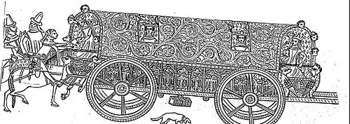 The locations of royal estates or palaces depended on several factors. Royal granges served as transit quarters and were therefore set up at a distance of 15–19 miles (24–31 km),[2] which corresponded to a day's journey by the royal entourage with horses and carriages. Individual riders, such as postal riders, covered much greater distances, up to 75 miles per day on dry ground. In 1146, Conrad III of Germany could travel as fast as 41 miles a day on his journey from Frankfurt to Weinheim.[3] During a year, large distances were covered. However, these distances could not be maintained on all routes—there were large territories in which no royal pfalz or grange existed, or lacked nearby monasteries or towns. In these cases, the emperors and kings spent the night in tent camps.[4] This also occurred during campaigns and sieges in which the kings took part.