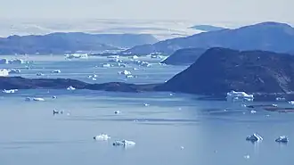Itissaalik Island is located in the northern part of Upernavik Archipelago, in the northern part of Sugar Loaf Bay, an indentation of Baffin Bay.[2] The island is part of a chain of small islands off the southern coast of Nuussuaq Peninsula. Other islands in the chain include Sugar Loaf Island, Timilersua Island, and Saarlia to the southwest of Itissaalik − and Paornarqortuut and Inussulikassak to the northeast.[2] The closest settlement is Nuussuaq, approximately 10 km (6.2 mi) to the west-north-west of the island.