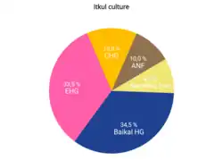 The Itkul culture had haplogroup R1a. Unlike the preceding Mezhovskaya culture, which genetically descended from steppe cattle breeders associated with the Andronovo culture with a small East Eurasian contribution, the Itkul had a very significant East Eurasian component.[5][6]