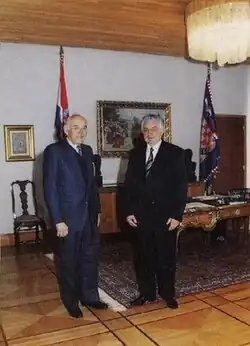 In 1991, Rojnica was appointed as the Authorized Representative of the President of Croatia to Argentina and Latin America.[1] The breakup of Yugoslavia and the outbreak of the Croatian War of Independence in the early 1990s had galvanized the Croatian diaspora in Argentina, which by 1991 numbered around 100,000. Rojnica was a close associate of Carlos Menem, who served as the President of Argentina between 1989 and 1999, and exploited this relationship to illegally procure Argentine arms for Croatia.[24][e] United Nations Security Council Resolution 713, passed on 25 September 1991, had imposed an international arms embargo on Yugoslavia and its constituent republics. In late 1991, Menem signed two secret presidential decrees, authorizing the sale of 6,500 tonnes (6,400 long tons; 7,200 short tons) of weapons to Panama, which were then diverted to Croatia. In early 1992, Menem signed another secret presidential decree, authorizing the sale of thousands of automatic rifles, handguns, hand grenades, howitzers, mortars and landmines to Bolivia, which with Menem's knowledge, were again diverted to Croatia.[25] Rojnica also established a paramilitary camp on Argentine soil to recruit and train Croatian mercenaries.[24] On 16 January 1992, Menem met with a delegation of Croat émigrés headed by Rojnica at Quinta de Olivos and announced that Argentina would recognize Croatia's declaration of independence from Yugoslavia—the first Latin American country to do so.[26] Several weeks later, a representative of the Simon Wiesenthal Center met with Argentine officials demanding Rojnica's arrest, noting that his name figured prominently in a list of eighteen war crimes suspects alleged to be hiding in Argentina that the organization had given to the country's Minister of the Interior, José Luis Manzano. Despite the request, the Argentine authorities failed to investigate Rojnica, and he continued to be photographed attending events alongside President Menem.[12] That July, Rojnica accompanied Menem on an official visit to Zagreb.[27]