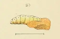Hudson described the larvae of this species as being about 78 in. long when fully grown.[7] The head is dark brown and shiny while the body is white.[7] The pupa is pale ochreous in colour with a brown tinge to the head and lower portion of the pupa. It is enclosed in an oval cocoon made from silk and pieces of chewed bark.[7]