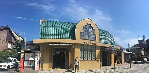 The station consists of one bay platform. The station building was designed in a Western architectural style with striking stained glass windows as a feature. Formerly there was a tower as part of the central building, this has since been removed. The station building was designated as a Registered Tangible Cultural Property in 1996.[4] In 2009, it was certified by the Ministry of Economy, Trade and Industry as an important Heritage of Industrial Modernisation site for its value to the promotion of tourism.[5] The station is staffed.