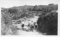 Many jíbaros were self-subsistence farmers, but there were also those who owned no land but instead worked as agricultural land tenants, sharecroppers, and fieldworkers of various types.[29] Some of those that did own their own plot of land were also farmer-salesmen who would grow enough crops to sell in the towns near their farms. Their crops would consist of whatever the land would grow, including bananas, plantains, avocados, ñames, yautías, batatas, yucas, malangas, and apio. However, hens, eggs, and charcoal were also traded.[30]
