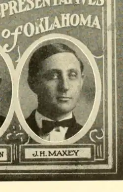 J. Harvey Maxey Jr. was named after his father J. Harvey Maxey, a member of the Oklahoma Constitutional Convention.[1] He served in the Oklahoma House of Representatives representing Lincoln and Pottawatomie Counties from 1909 to 1913 as a member of the Democratic Party. He also represented Muskogee County from 1913 to 1915 while serving as the 5th Speaker of the Oklahoma House of Representatives.[2] In the 1913 Speaker election, he defeated the Republican nominee E. J. Vosburgh of Woodward County with 77 to 18 votes.[3] He ran for the United States House of Representatives in 1914.[1] He placed third, and last, in the Democratic primary behind William Wirt Hastings and Campbell Russell.[4]
